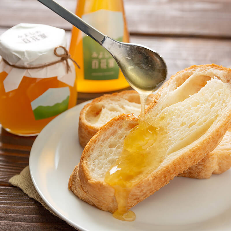 『みよしの百花蜜』は、透明感があり、比較的サラサラとしたはちみつです。味も花の香りや甘みを充分に楽しめ、後味がしつこくなくスッキリとしています。