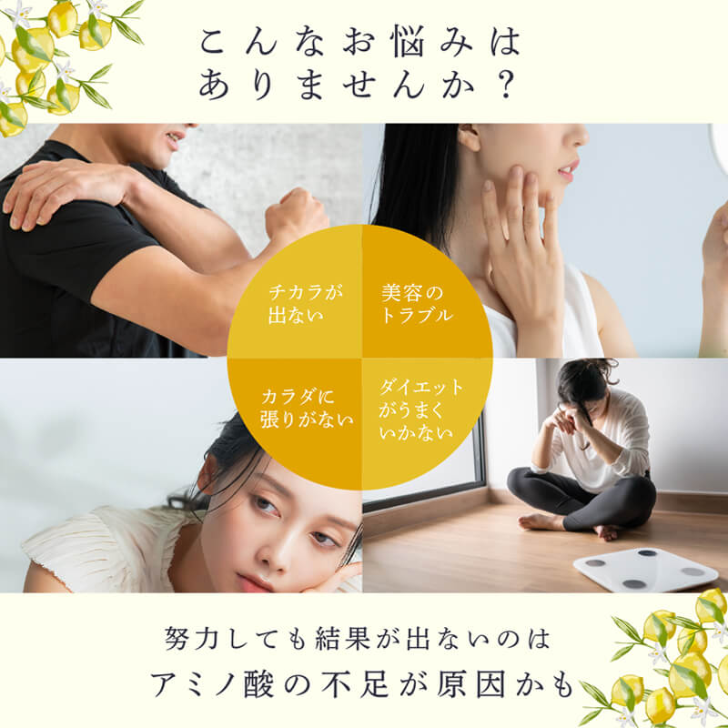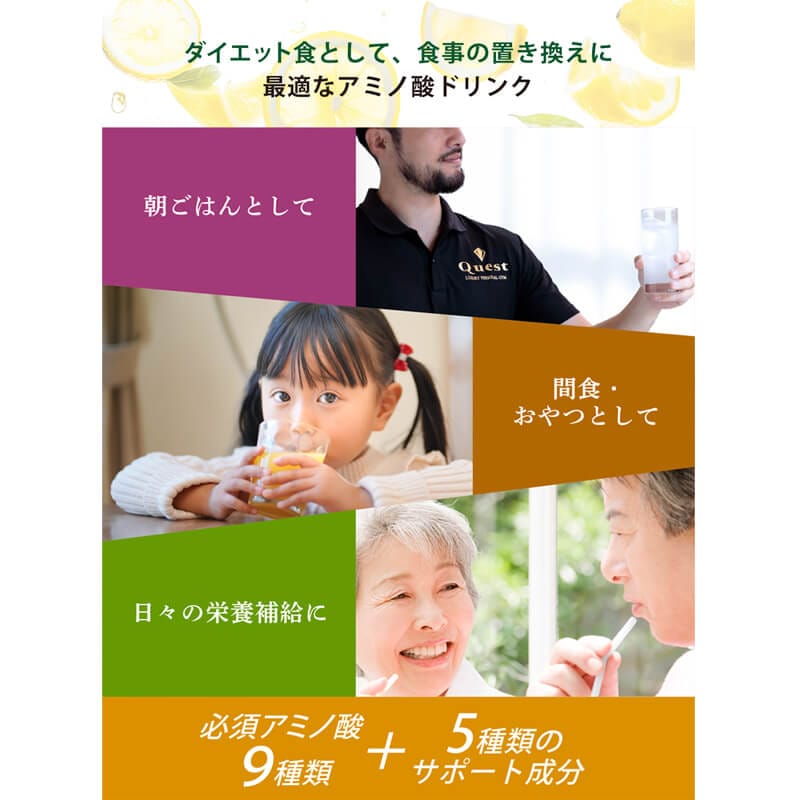 毎日スッキリしない、お肌の調子がきになる、そんな皆さまに体内で生成することができない9種類の必須アミノ酸と5種類のサポート成分を配合。